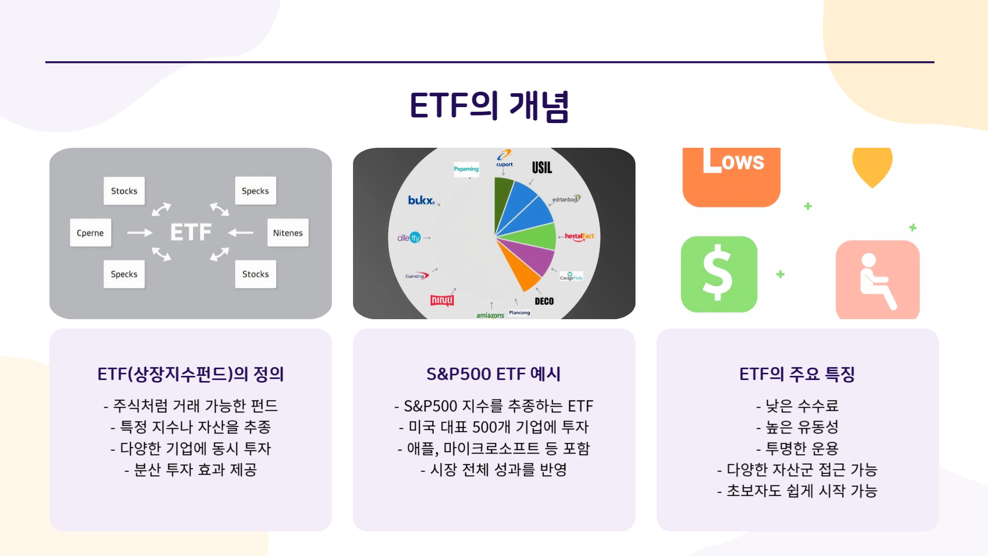 ETF는 주식처럼 사고팔 수 있는 펀드 상품이에요. 예를 들어, S&P500이라는 미국 주식 지수를 따라가는 ETF를 사면, 미국을 대표하는 500개 기업에 자동으로 투자하는 셈이죠. 애플, 마이크로소프트, 구글 같은 기업들이 포함돼 있어요.
